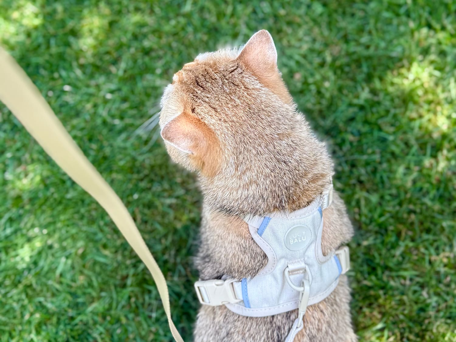 👣 Beginne langsam. Lasse deine Katze erstmal an das Geschirr gewöhnen. Du kannst es ihr zu Hause anziehen, damit sie sich daran gewöhnt und es als etwas Normales ansieht.