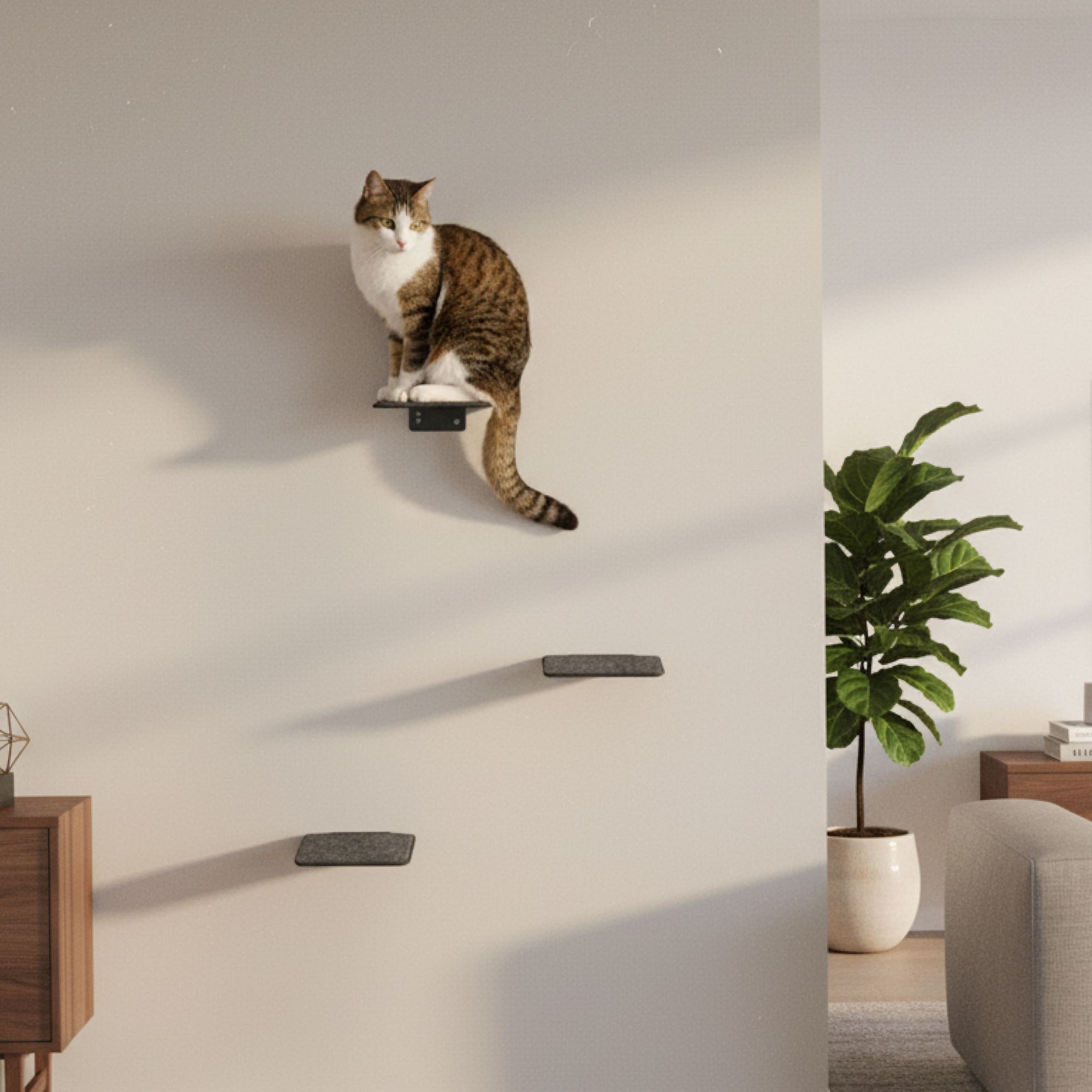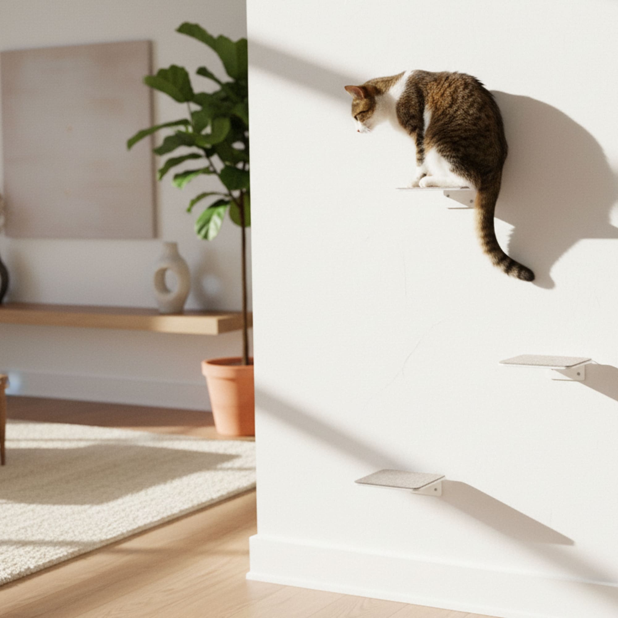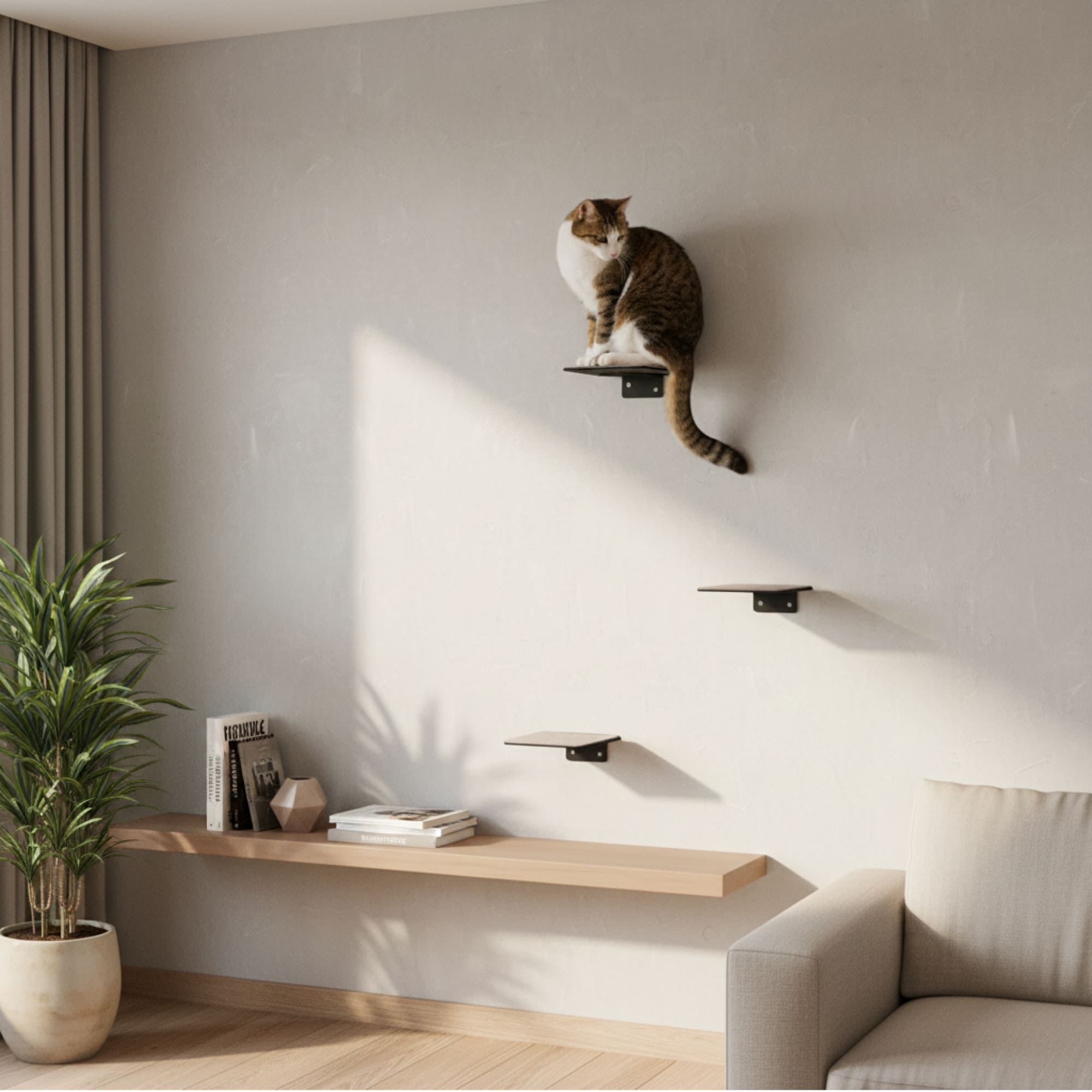 Mit den STEPS Kletterstufen lässt sich ganz einfach ein vertikaler Spielplatz schaffen. DieKatze hat viel mehr Raum zur Verfügung, ohne dass die filigran designten Kletterstufen Raum einnehmen.