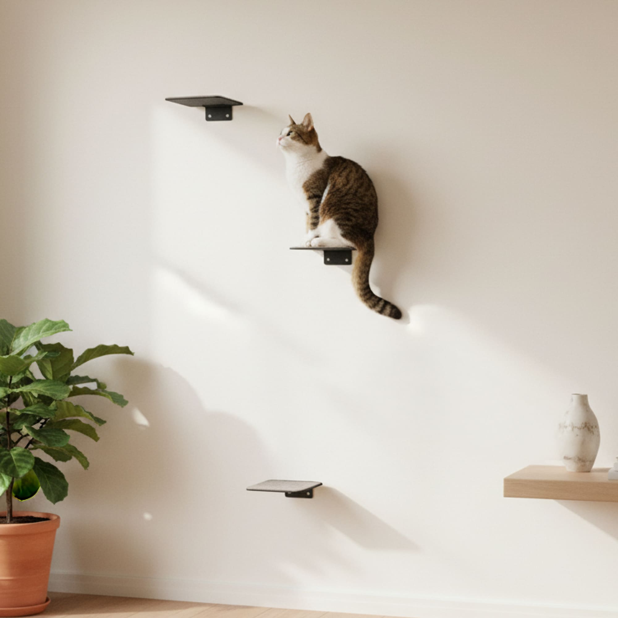 Mit den STEPS Kletterstufen lässt sich ganz einfach ein vertikaler Spielplatz schaffen. Die Katze hat viel mehr Raum zur Verfügung, ohne dass die filigran designten Kletterstufen Raum einnehmen.